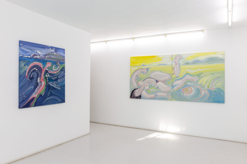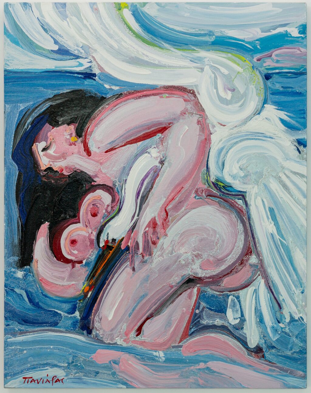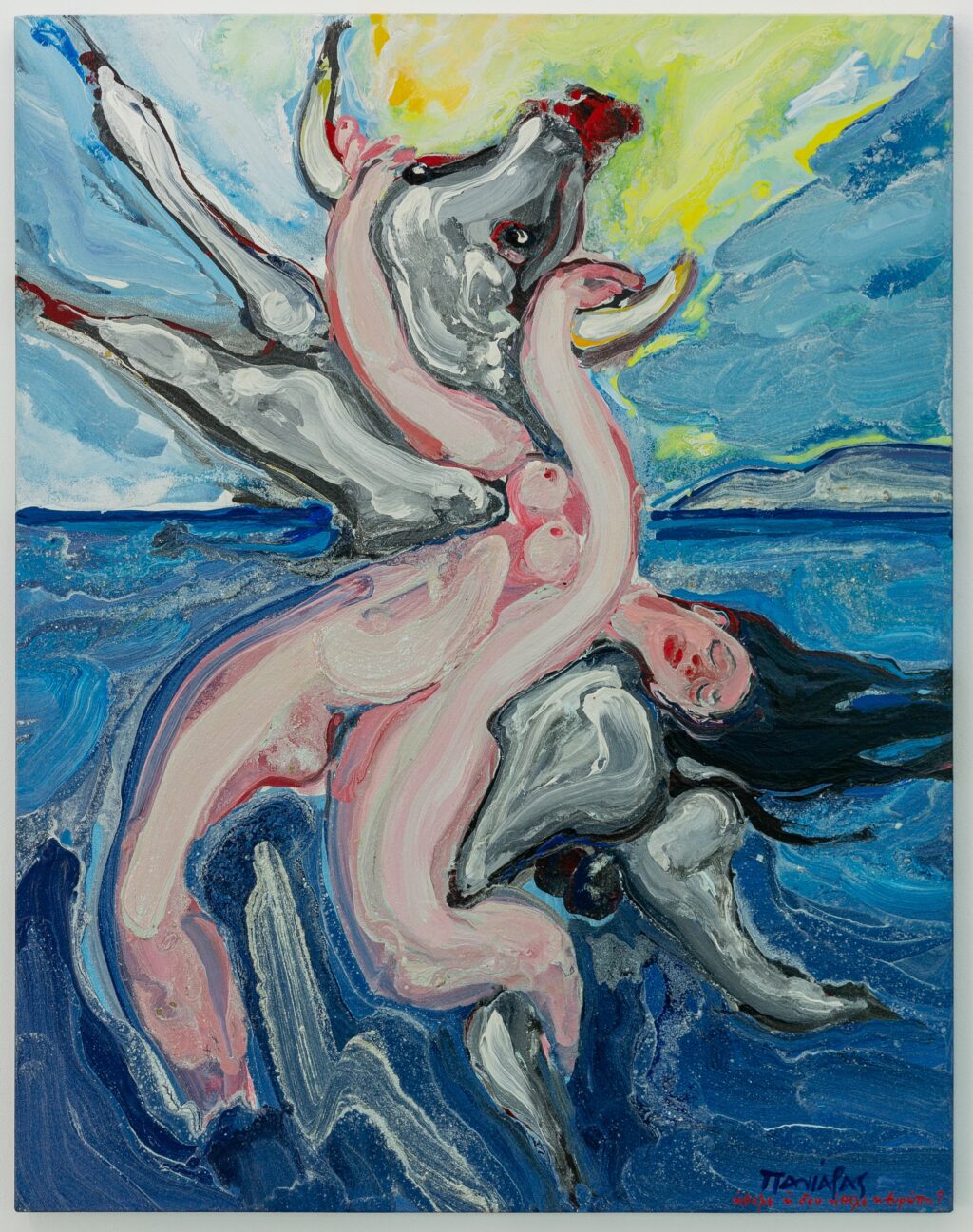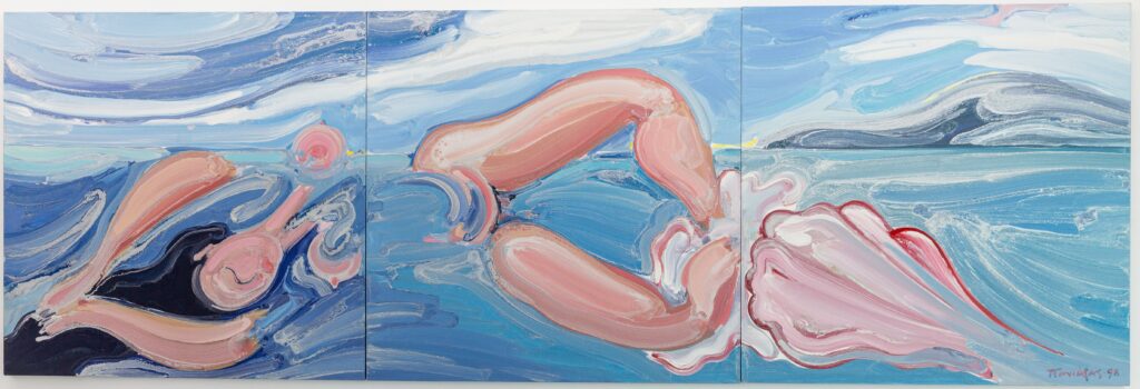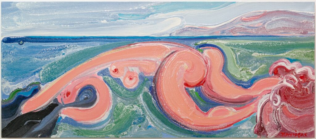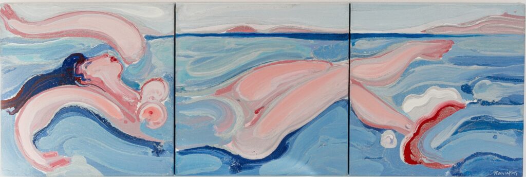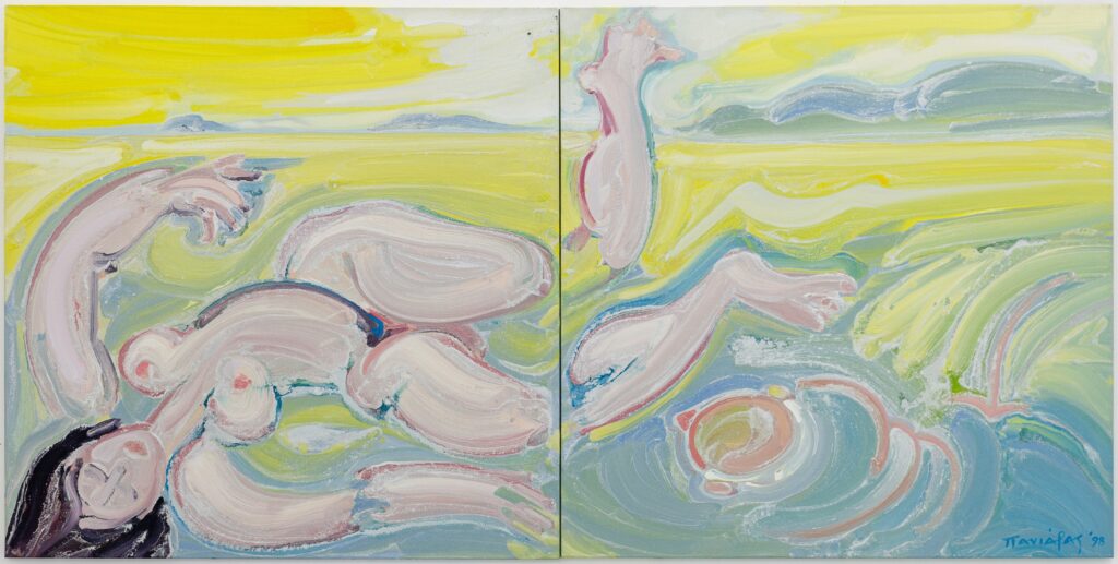 Kostas Paniaras (1934–2014), who grew up in the seaside town of Kiato, was shaped by the constant presence of the sea: the horizon’s endless line and the image of women, family members or strangers, bathing in the local waters. In Kolymvitries (Female Bathers, 1997–1998), included in the exhibition Summer Nostalgia, these figures seem to move with the waves in a delicate, almost choreographed balance. At the same time, they transcend the everyday, taking on a mythological aura, becoming princesses like Europa or Leda, or recalling the emerging figure of Aphrodite rising from the sea, so that Paniaras’ bathers, whether kin or unknown passersby, inhabit both memory and myth.