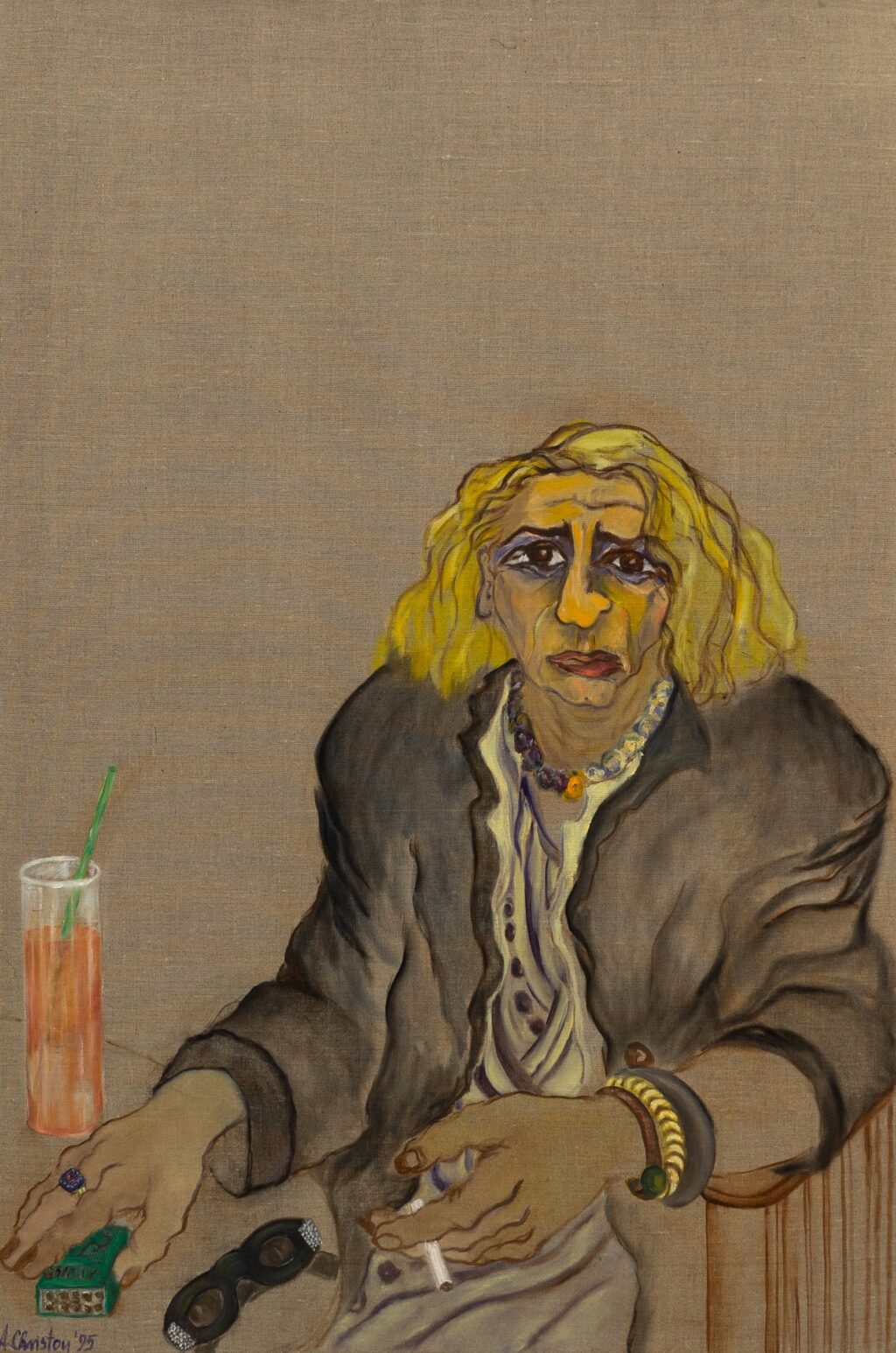 Christou’s portraits draw on the textures of everyday life—cafés, domestic interiors, island rituals—blending myth, memory, and lived experience. Her protagonists—men in cafés, beggars, sex workers, friends, lovers, and alter egos—appear as everyday heroes in dreamlike scenes that blur fact and fiction. Surreal symbolism and self-referential gestures lend the work both tenderness and quiet resistance, exploring companionship, solitude, and the subtle performances of daily existence.