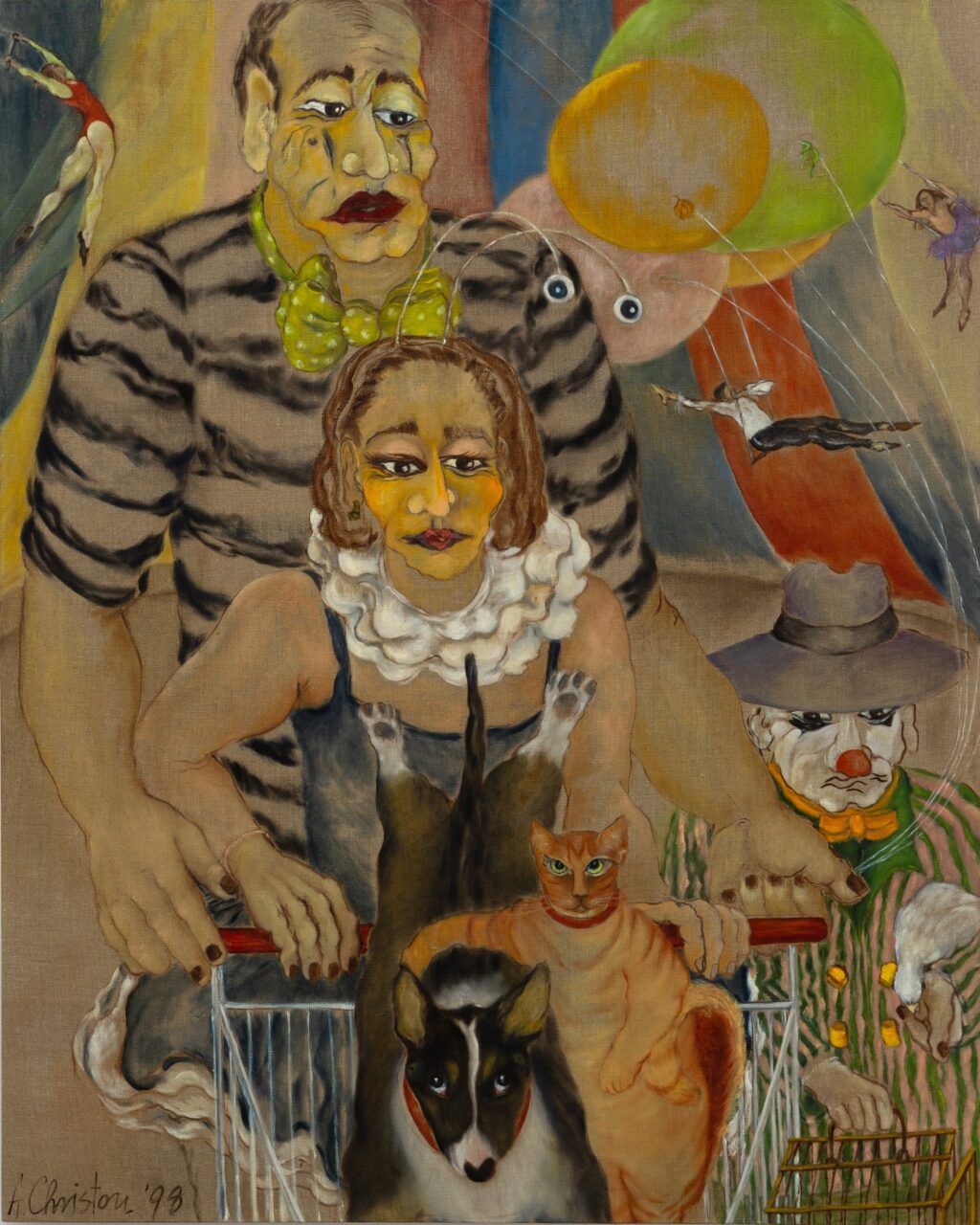 Despite limited exposure during her career, Christou exhibited at the Benaki Museum in Athens and the Institute for Graphic Arts & Painting in Marburg, Germany, leaving behind a quietly powerful legacy that continues to resonate. Public Secrets, curated by Milovan Farronato at The Breeder in the summer of 2025, brought renewed attention to key canvases from the early to late 1990s. Works such as Alexandra as Tightrope Walker between Athens and Astypalaia (1992), A with Loves of Her Life (1995), and Portrait A. with Aris Circus (1998) reveal autobiographical layers in which personal myth and everyday encounters merge. Charged with private meaning yet resonant with broader late-20th-century Greek life, Christou’s paintings stand as vivid visual diaries—testaments to resilience, marginality, and the enduring poetry of ordinary people and places.