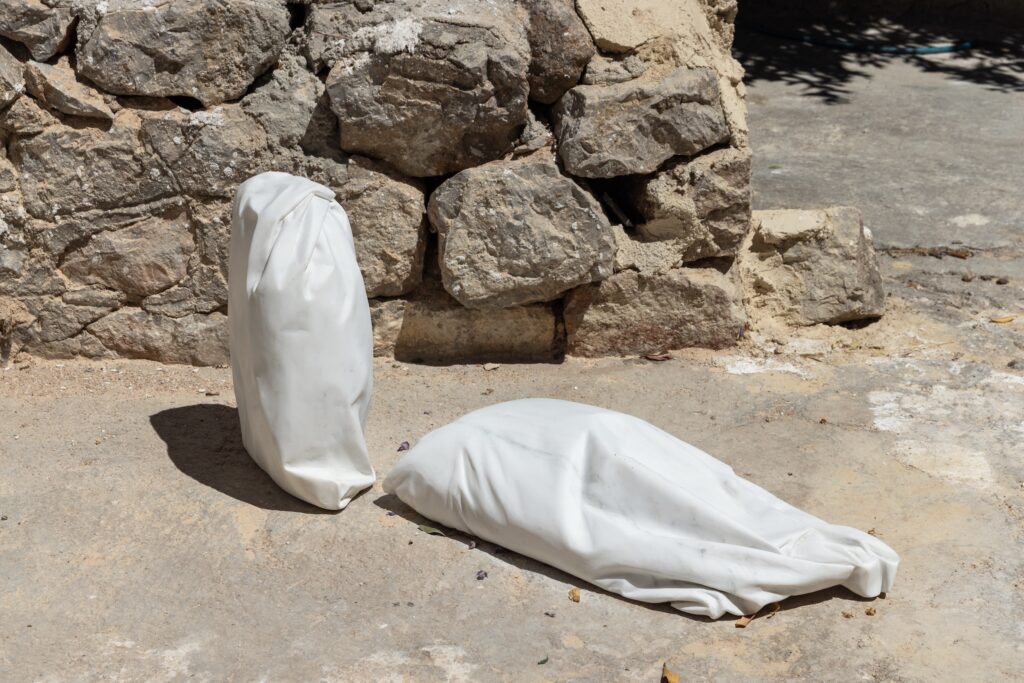 Over the past several years, Andreas Lolis has created a series of floor-based sculptures that scrupulously mimic the appearance of materials commonly used in the packing and shipping of commodities—cardboard boxes, wooden pallets, sacks—many of which bear signs of apparent wear and tear. It is only upon close inspection that viewers realize these are not found objects, but meticulously hand-carved marble sculptures.