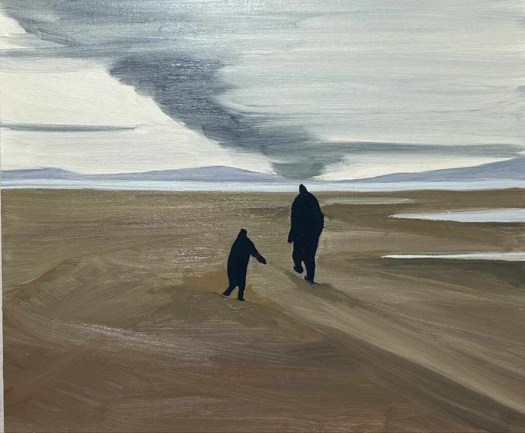 Natsuko Kiura’s paintings seek to capture the memory of a memory, distilling fleeting impressions of landscapes into luminous, pared-down compositions. Beginning with her own photographs of everyday scenes—a beach, a stretch of rolling hills, a roadside view—Kiura gradually removes detail, reducing each image to its emotional essence. What remains is not a faithful depiction but a translation of sensation: a landscape as remembered, reimagined, and transfigured.