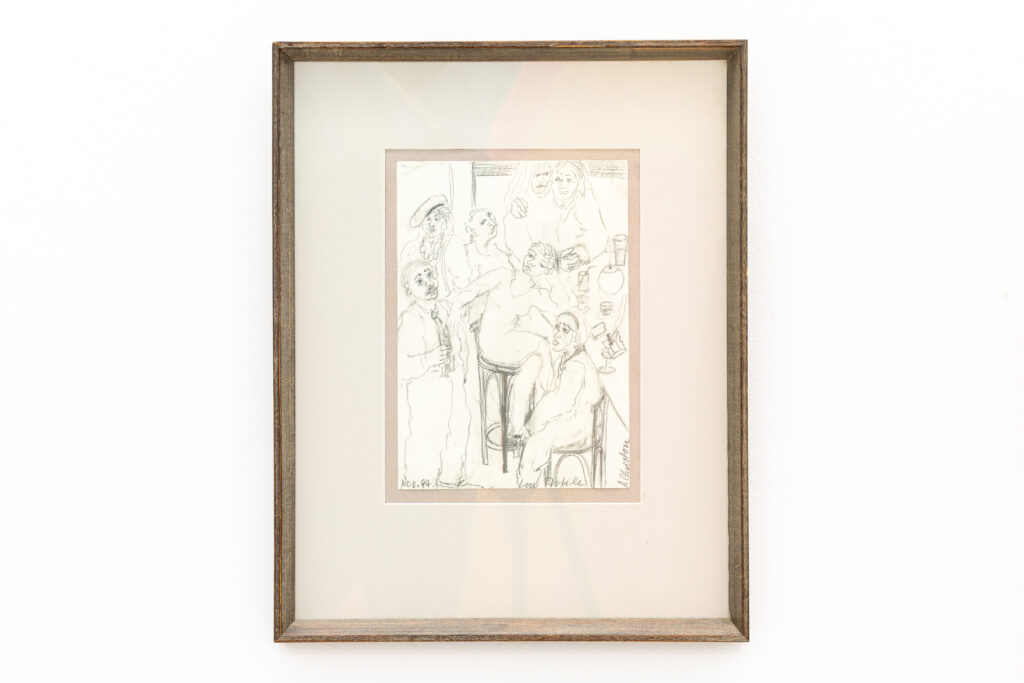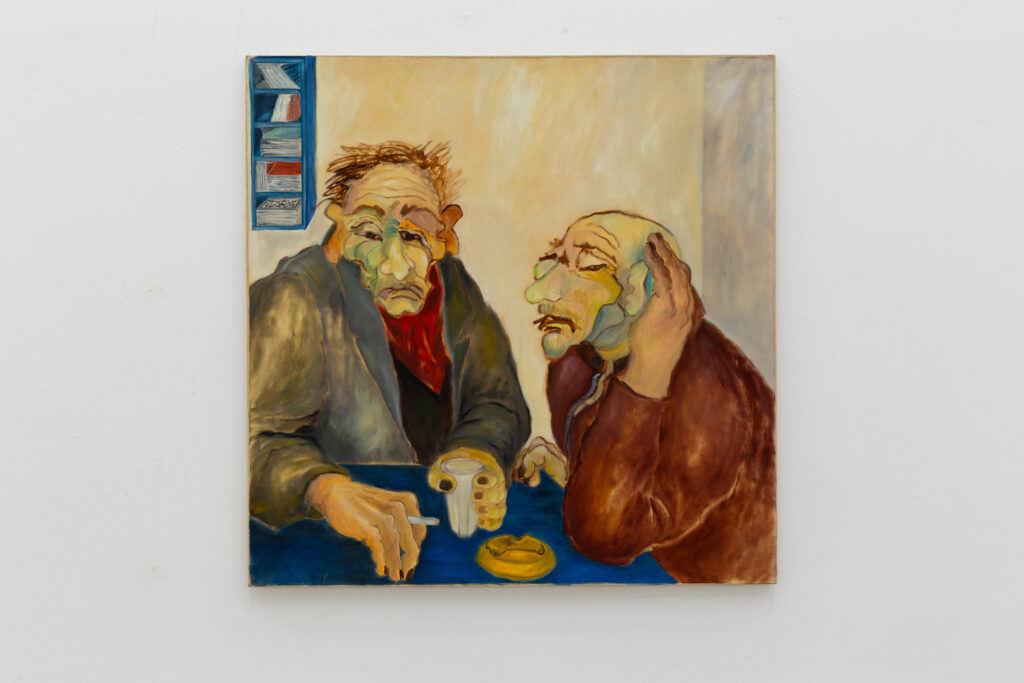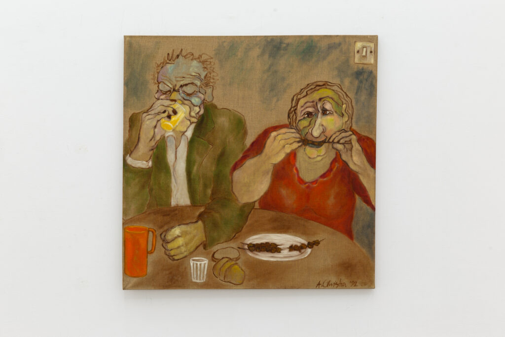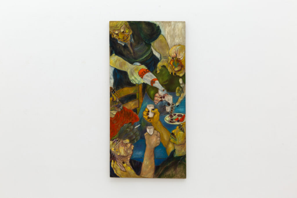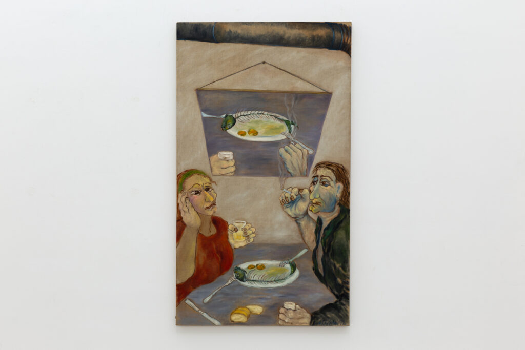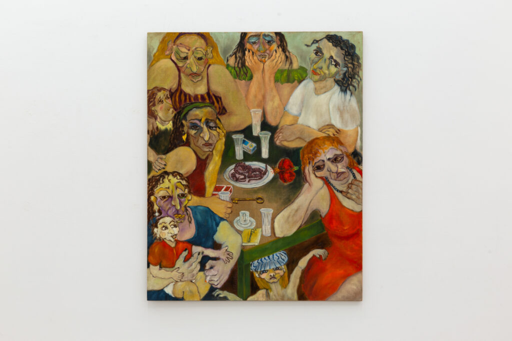 The paintings in this exhibition take cues from the winding streets of Psirri (Athens) and the ubiquitous gatherings Christou observed in her local urban epicentres. The works focus on Greek kafeneia – cafés or coffee shops serving a mix of ouzo, retsina, strong coffee and meze in simple, informal settings – and kreatagores – bustling markets or butchers’ shops that offer a place to eat, gather or wait. Christou was interested in the people overlooked in her neighbourhoods, the marginal characters she passed every day, indiscriminate in her choice of protagonist. In The end of the relationship, Kafeneia (1992), a hanging mirror reflects the shared table, magnifying the strewn leftovers and spilled digestifs symbolic of a broken relationship. In her unromanticised depictions of observed subjects, her paintings maintain compassion, vibrancy and a palpable energy. Groups of women, or geinaikes, inhabit many of Christou’s works, dominating café and market scenes of shared meals, card games, smoking, drinking and slow-paced communion. The intergenerational grouping in Untitled (Kafeneia Women’s Table A. with Friends) (1991) illustrates how these non-domestic spaces are platforms for camaraderie, independence and performance.