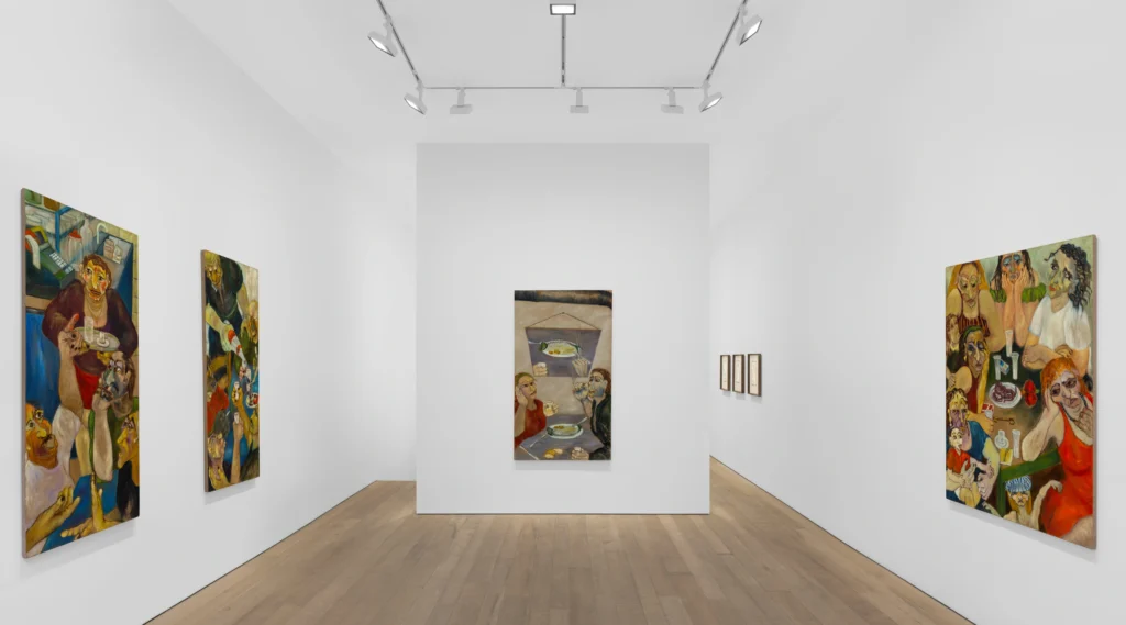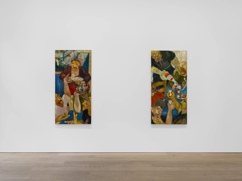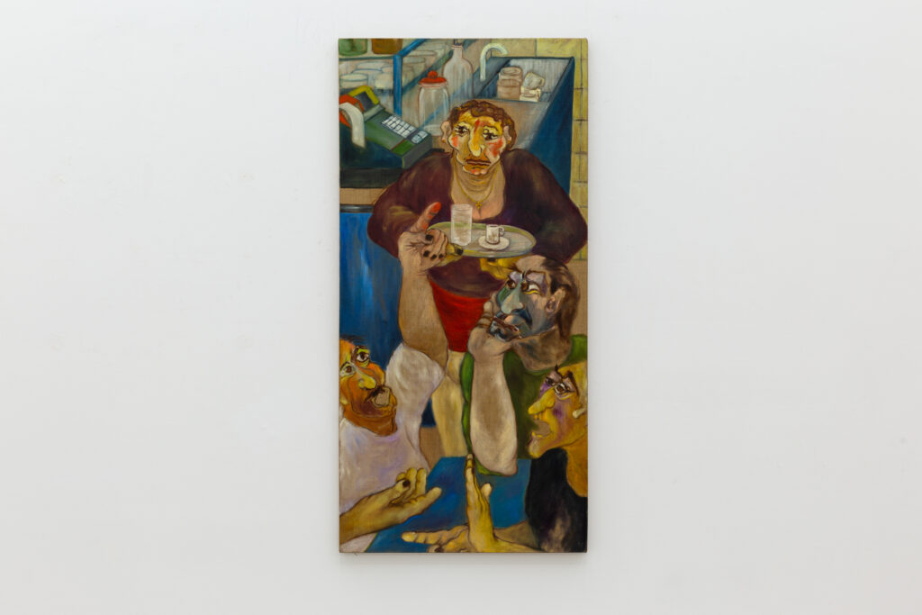 Throughout art history bar scenes have mined the intense choreography of social interaction for which a bar provides a stage. Christou, like Gilroy and Hogarth, like French Impressionists Toulouse-Lautrec, Degas and Manet, as well as the Neue Wilde German painters like Immendorf and Kippenberger who she knew, captures the joy and tragedy of the tavern’s intoxicating, atmospheric, dynamic.