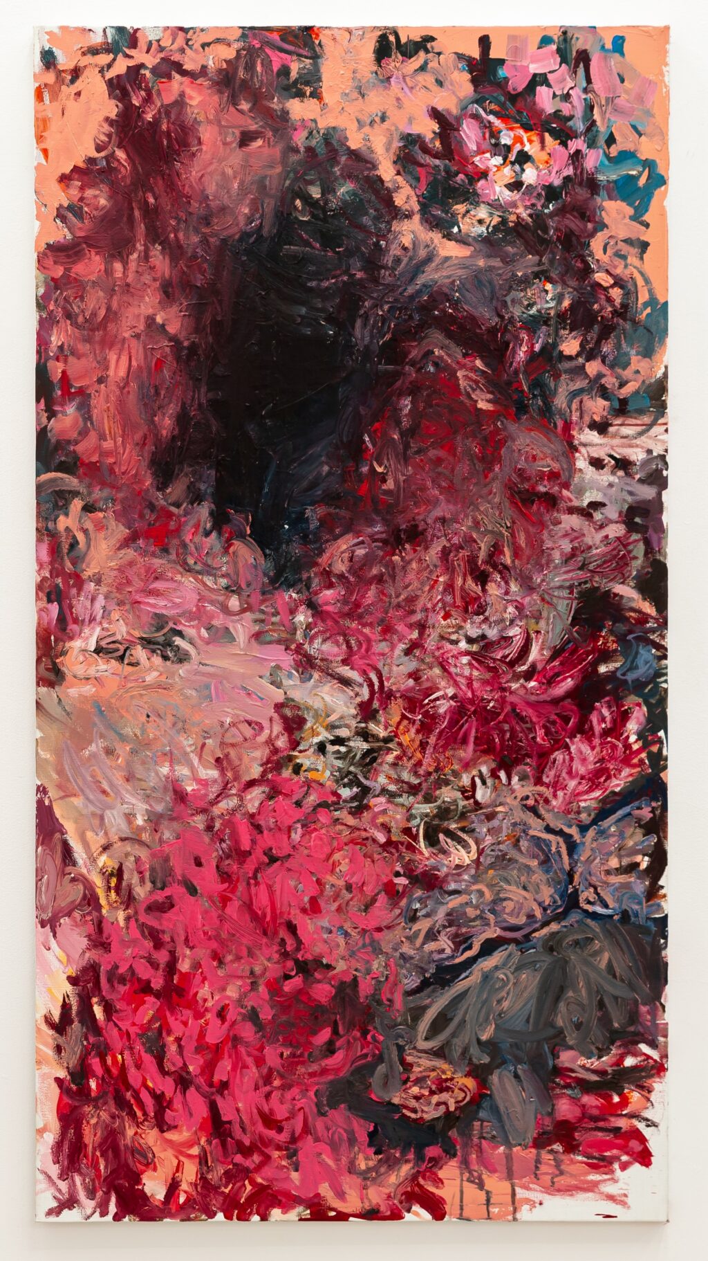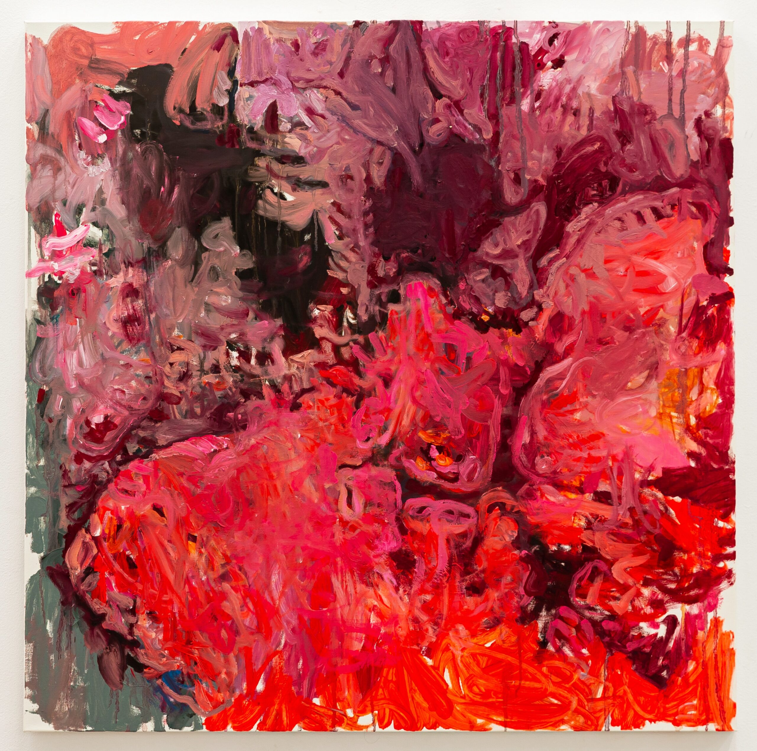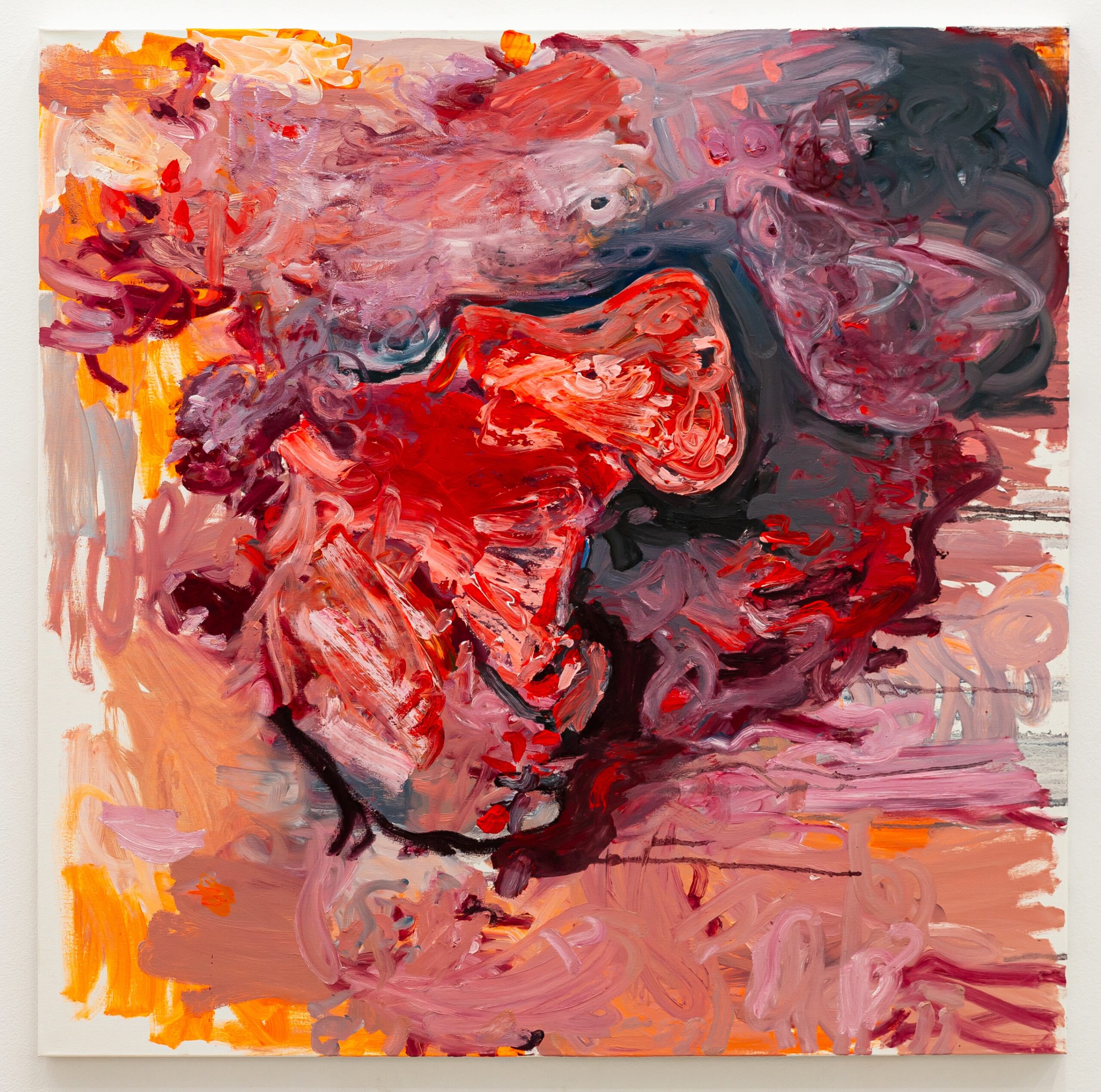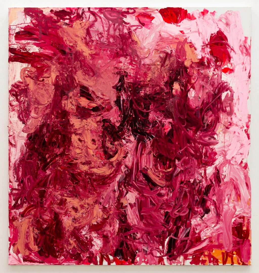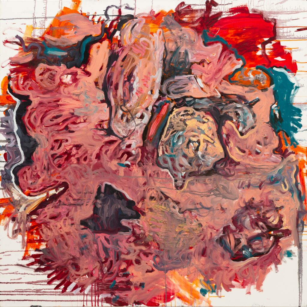Her colors are reminiscent of wounding, collision, and fragility, while simultaneously drawing from nature and its shifting images. She feels the need to find her place in the vast space of a blank surface, using broad gestures to navigate its large scale and uncover the work concealed within fluctuating dimensions. The canvas becomes her operating space for the dissection of the inner psyche. Paint and color transition through familiar yet uncanny figures and shapes.