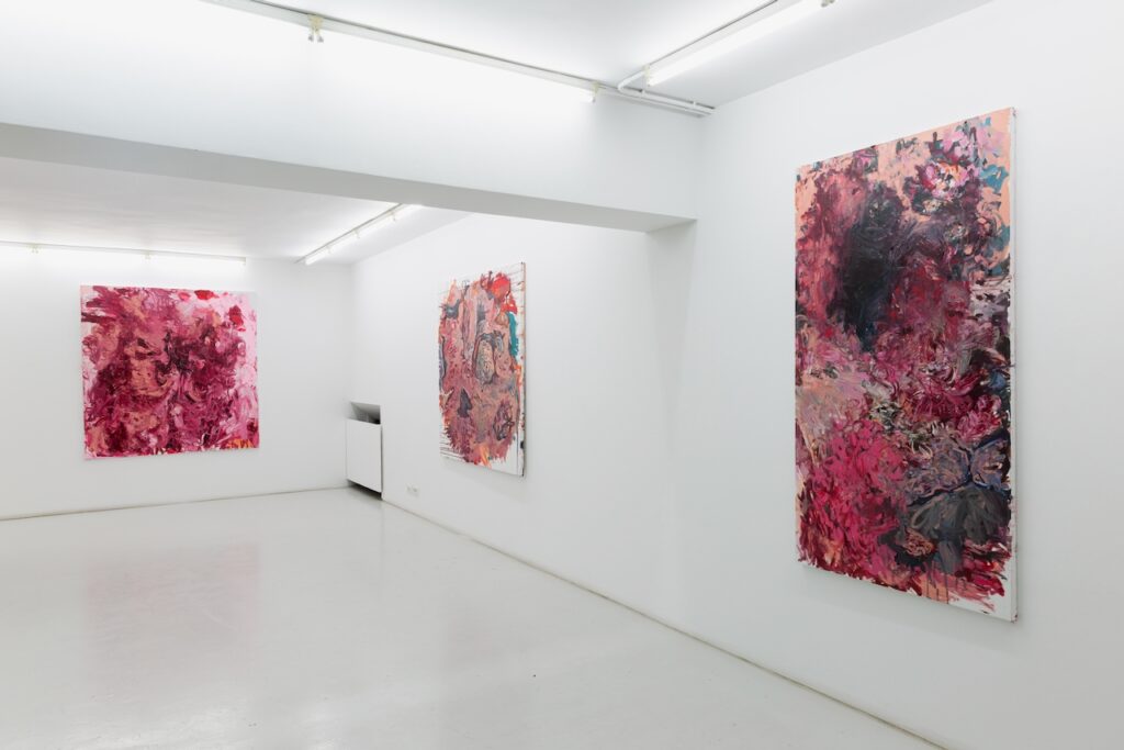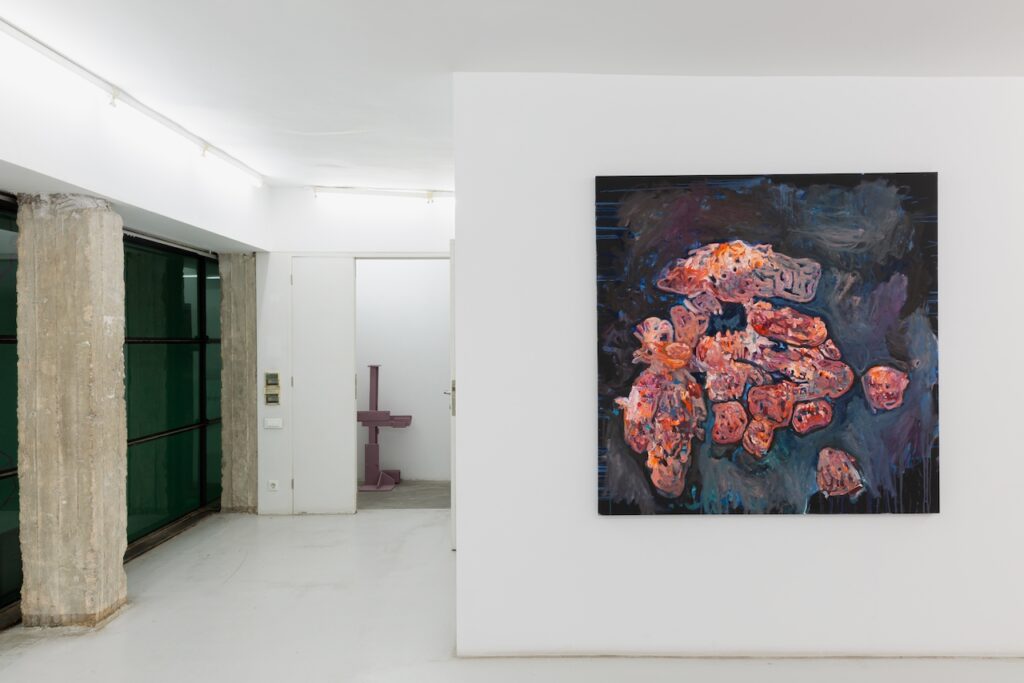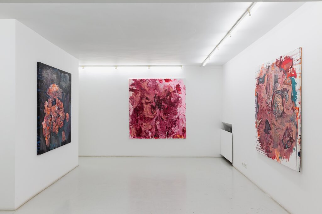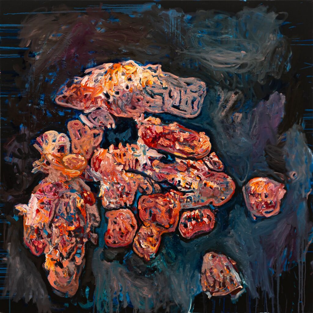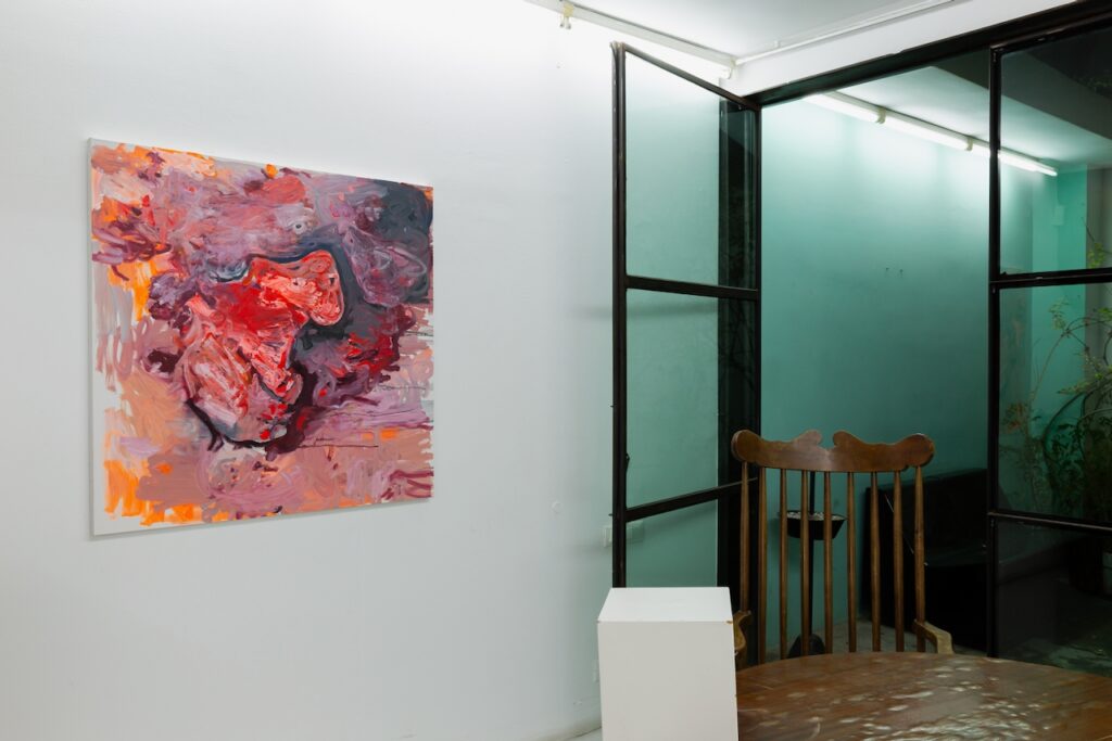Gkinosati’s explorations engage with themes of self-actualization, constant transformation, and the ambiguity of intangible forms, inviting viewers to fill in the blanks left by the abstract nature of her artistic style. Each painting functions like an X-ray of her inner world while also posing as a mirror, reflecting the viewer’s own visual memory and lived experience. Eluding direct narratives, she is interested instead in the decisiveness of encounter, how each person, shaped by their own perspective, uncovers a different story within the same work. Whether the viewer is appalled by the remnants of her intestinal forms or sympathizes with her prismatic outbursts, the work has reached the core of its intention. Ultimately, her practice underlines the subtle yet profound influence of the unseen.