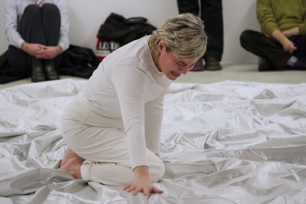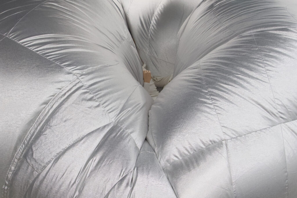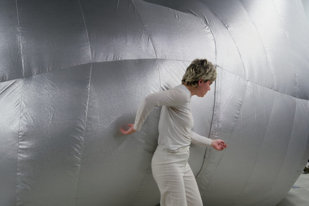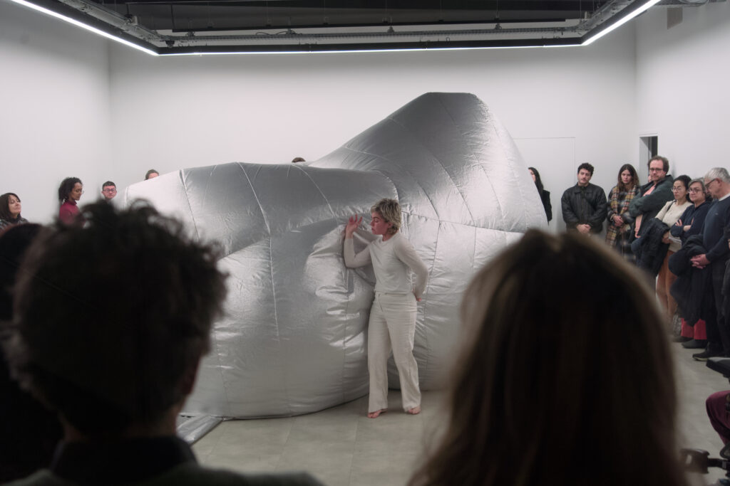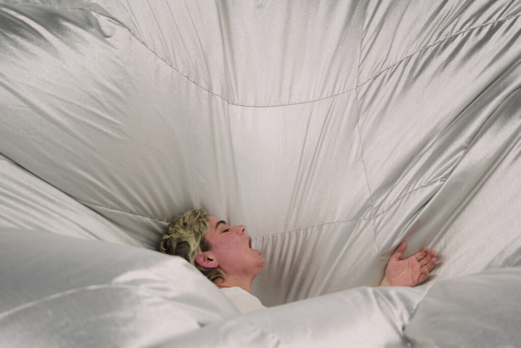 In Gone Gone Beyond, first chapter presented at the Götenberg Biennial, Sagri stages a performance with an inflatable sculpture to confront the rupture caused by grief. Breath becomes central: audible, sculptural, and affective, marking the boundary between presence and disappearance. The work builds on an encounter with poet Katerina Anghelaki-Rooke, whose final and only thetartical piece emerged from a place of deep personal loss. Through this lens, Sagri traces how sorrow destabilizes and reshapes identity. The performance sets a cycle of strain, release, containment, and adaptation into motion, between body and sculpture, visibility and invisibility, self and its becoming.