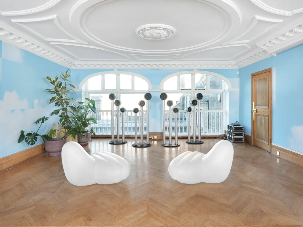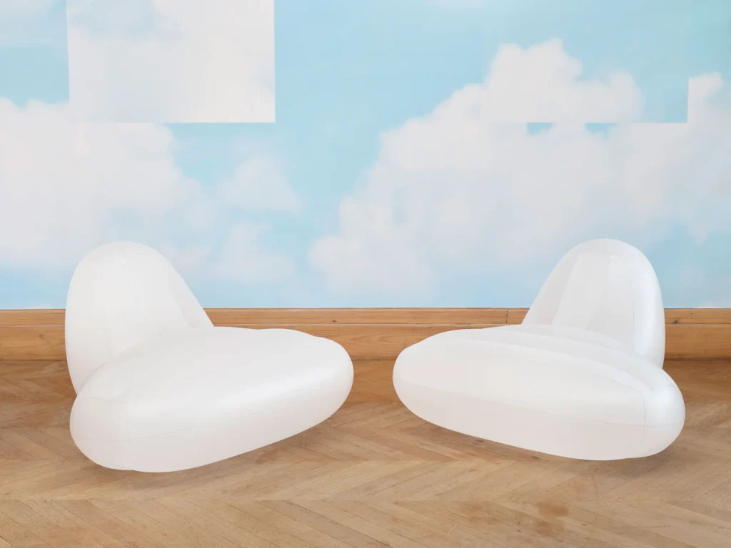A series of lightweight, air-filled structures inhabit the space, merging the oneiric with the technocratic. The Inflatable Chair by Objects of Common Interest extends the design duo’s ongoing research on inflatables—born from a desire to break free from the constraints of traditional materials and forms, echoing the utopian ideals of 1960s pneumatic experiments that envisioned air-filled structures as catalysts for radical spatial and social transformation. Realised in biodegradable plastic and designed to follow the natural form of the body in a state of repose, the chairs create an ephemeral landscape that oscillates between permanence and transition. Visitors are invited to contribute to a shifting topography shaped by their intuition, movements, and desires.