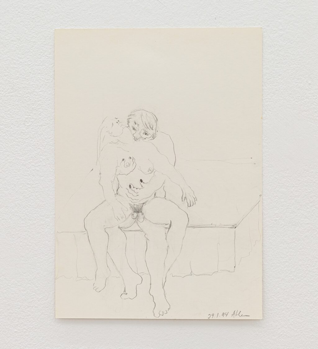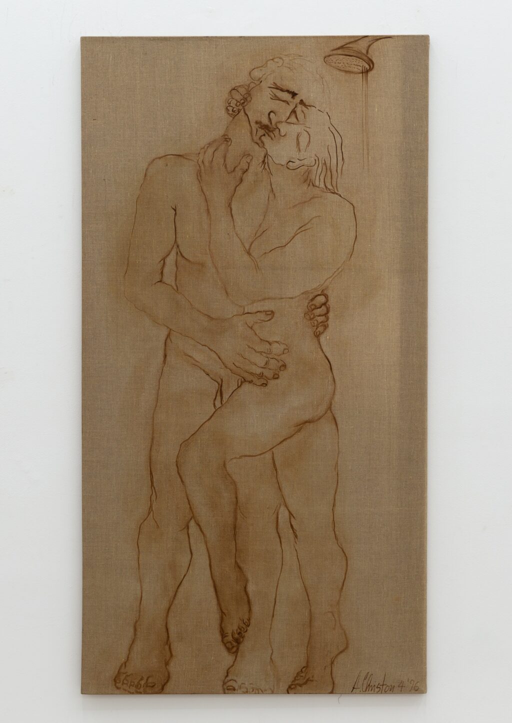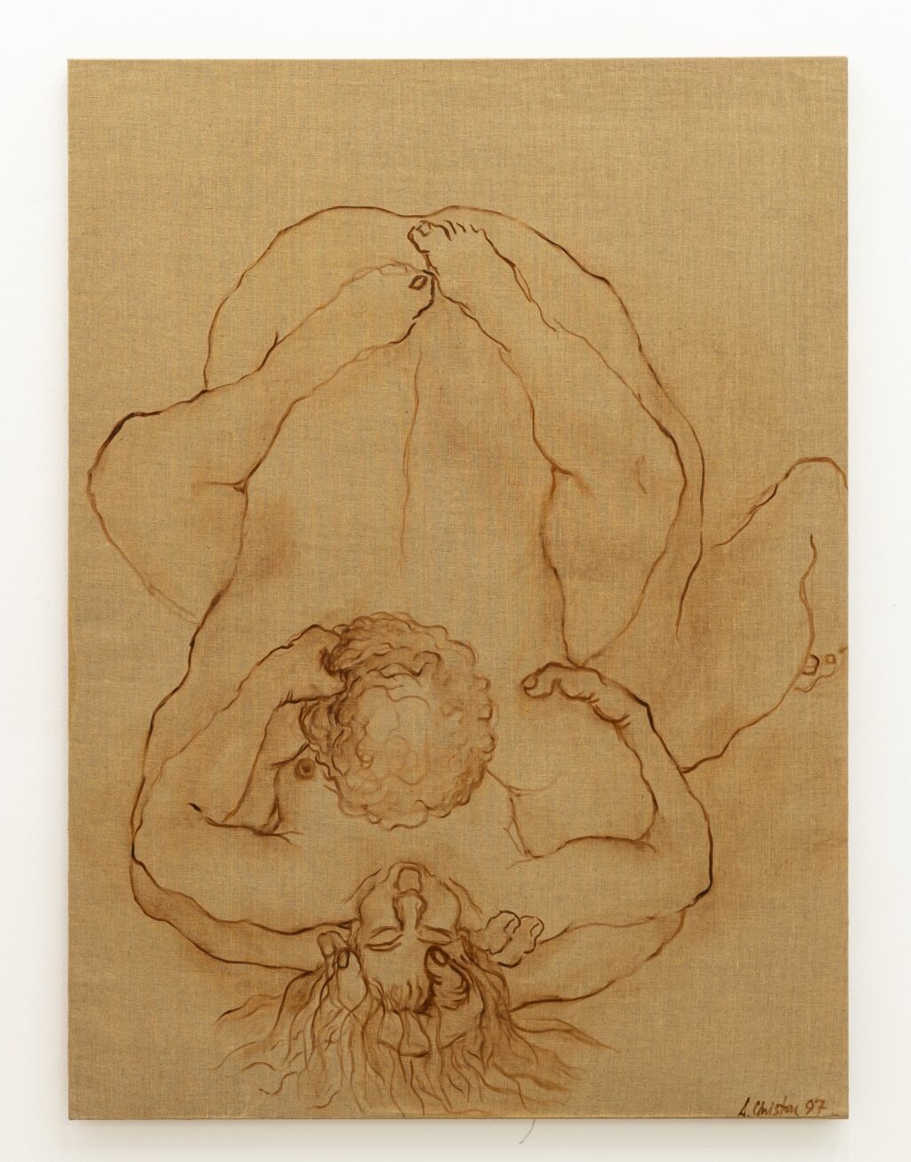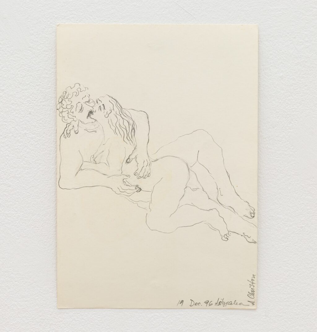 The erotic works are remarkable for their directness. In paintings such as Untitled (In Love under shower) (1996) and Untitled (In Love Holding on) (1996), bodies press into one another with urgency and reciprocity. The compositions are spare, often set against raw linen; the line is economical yet assured. Christou does not aestheticise desire into fantasy. Instead, she renders it physical — weighty limbs, grasping hands, flushed skin. A marginal note on one of her drawings reads: “I wanted to remember, but the body came first.” The body, in her work, is not a symbol but a fact — the site where memory, instinct and encounter converge.