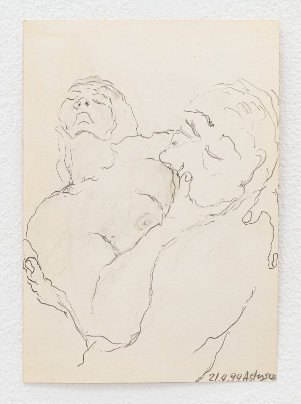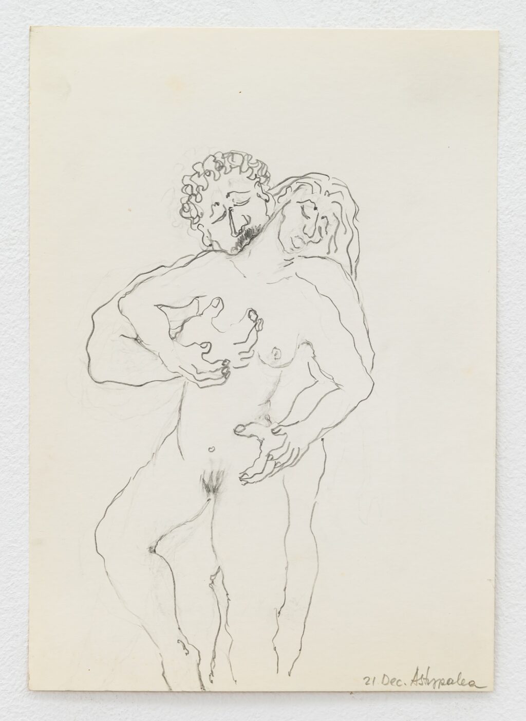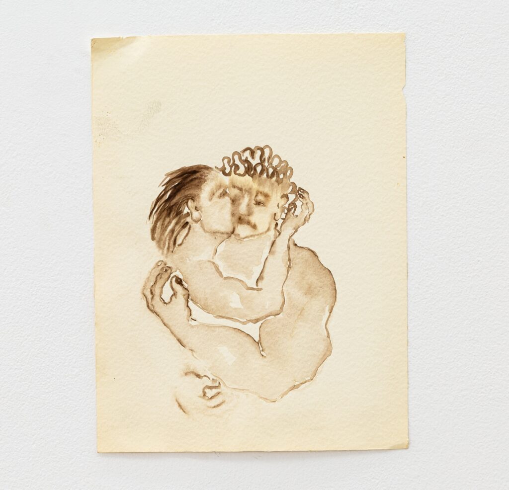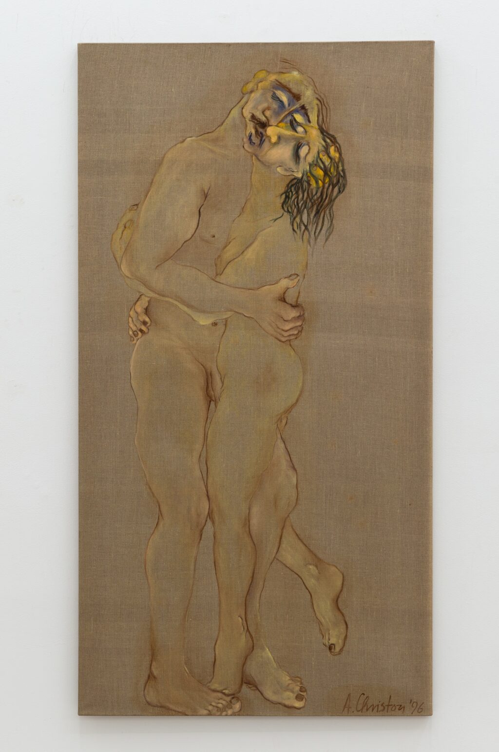The erotic works are remarkable for their directness. In paintings such as Untitled (In Love under shower) (1996) and Untitled (In Love Holding on) (1996), bodies press into one another with urgency and reciprocity. The compositions are spare, often set against raw linen; the line is economical yet assured. Christou does not aestheticise desire into fantasy. Instead, she renders it physical — weighty limbs, grasping hands, flushed skin. A marginal note on one of her drawings reads: “I wanted to remember, but the body came first.” The body, in her work, is not a symbol but a fact — the site where memory, instinct and encounter converge.