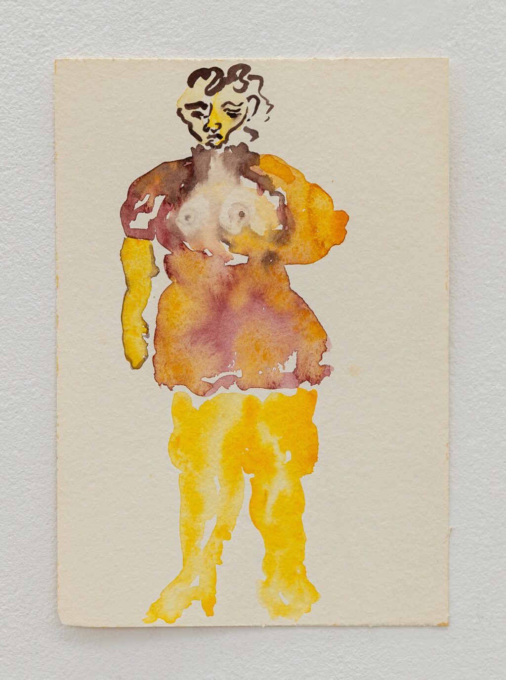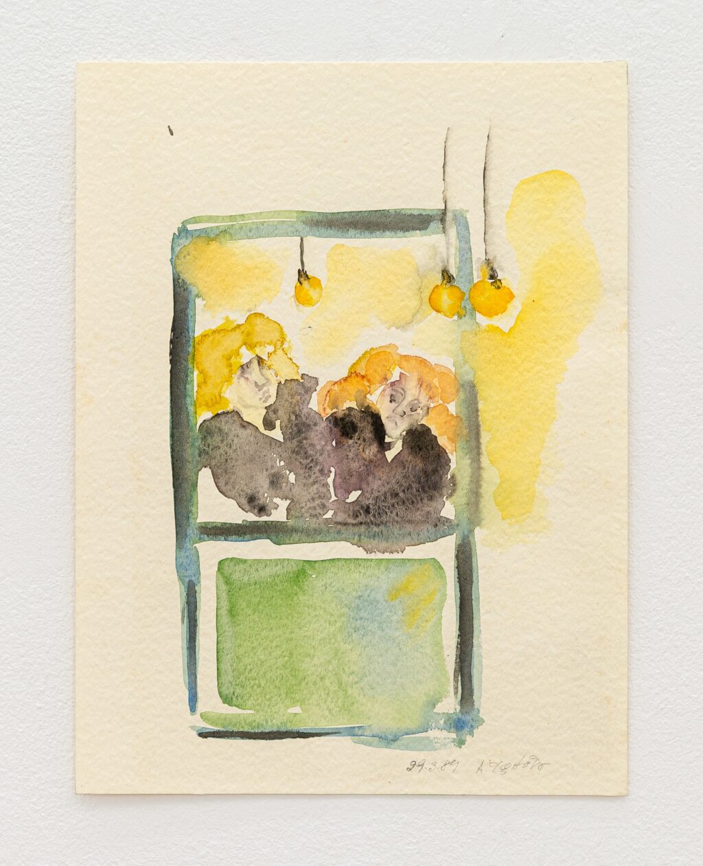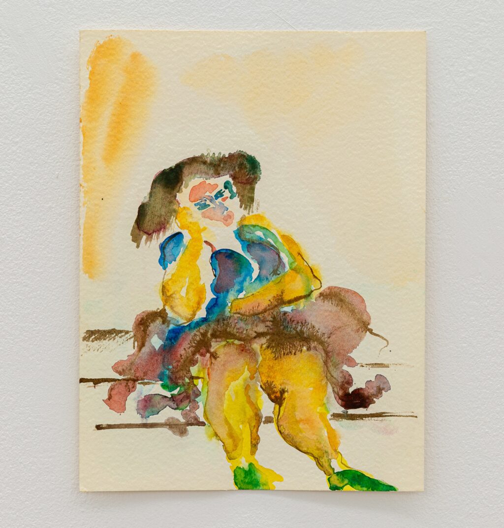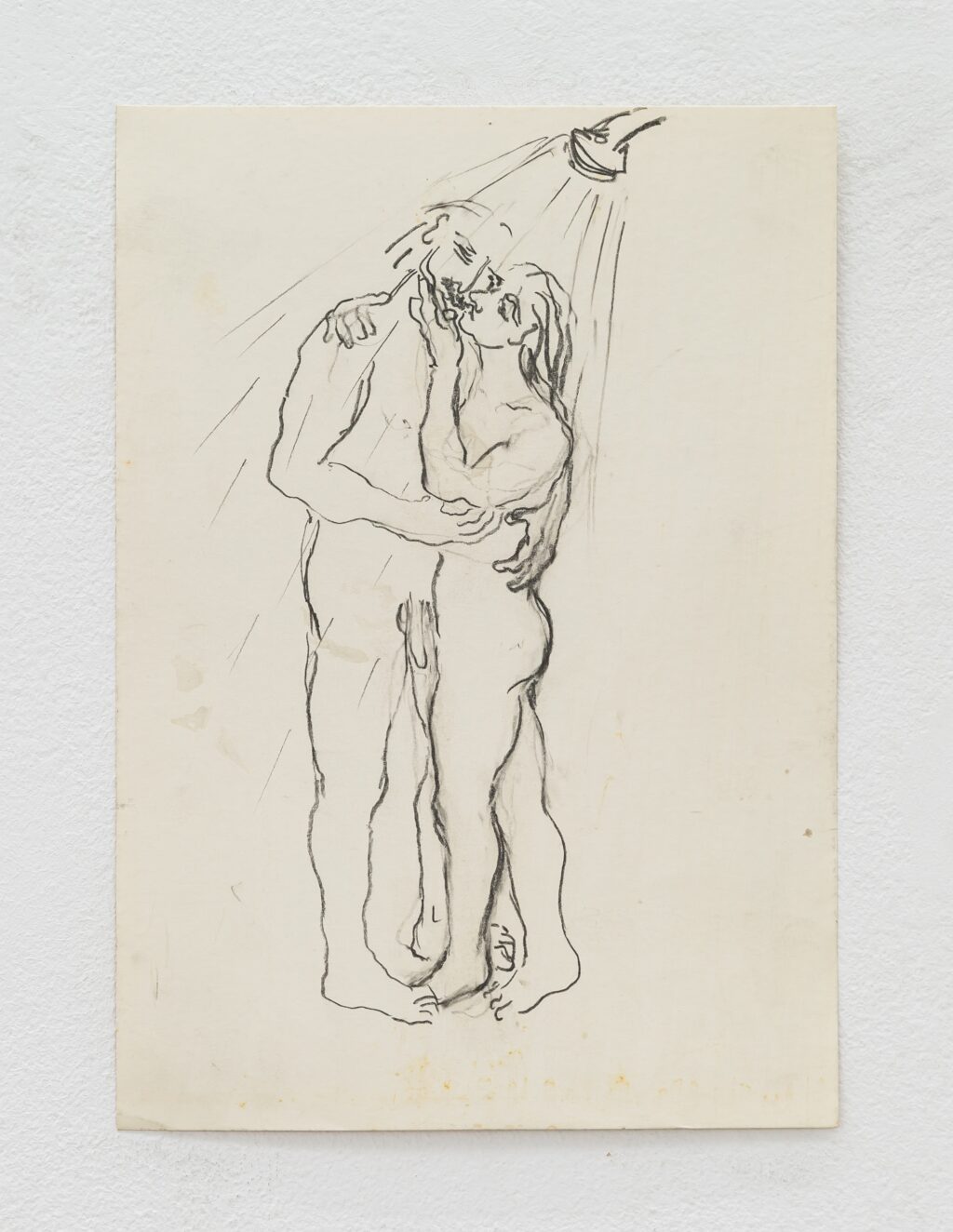The erotic works are remarkable for their directness. In paintings such as Untitled (In Love under shower) (1996) and Untitled (In Love Holding on) (1996), bodies press into one another with urgency and reciprocity. The compositions are spare, often set against raw linen; the line is economical yet assured. Christou does not aestheticise desire into fantasy. Instead, she renders it physical — weighty limbs, grasping hands, flushed skin. A marginal note on one of her drawings reads: “I wanted to remember, but the body came first.” The body, in her work, is not a symbol but a fact — the site where memory, instinct and encounter converge.