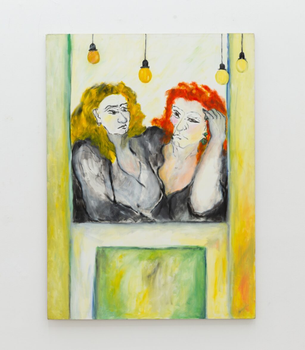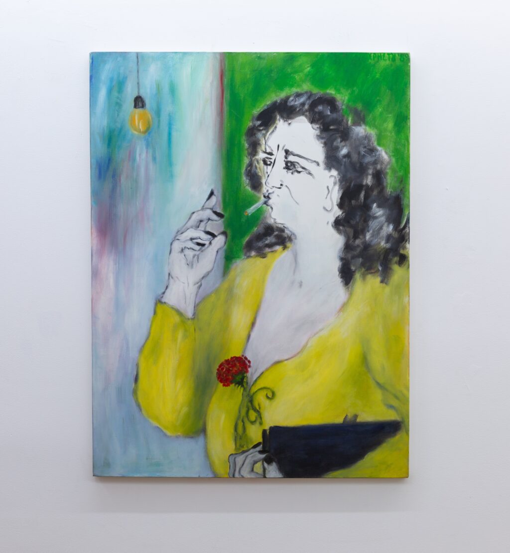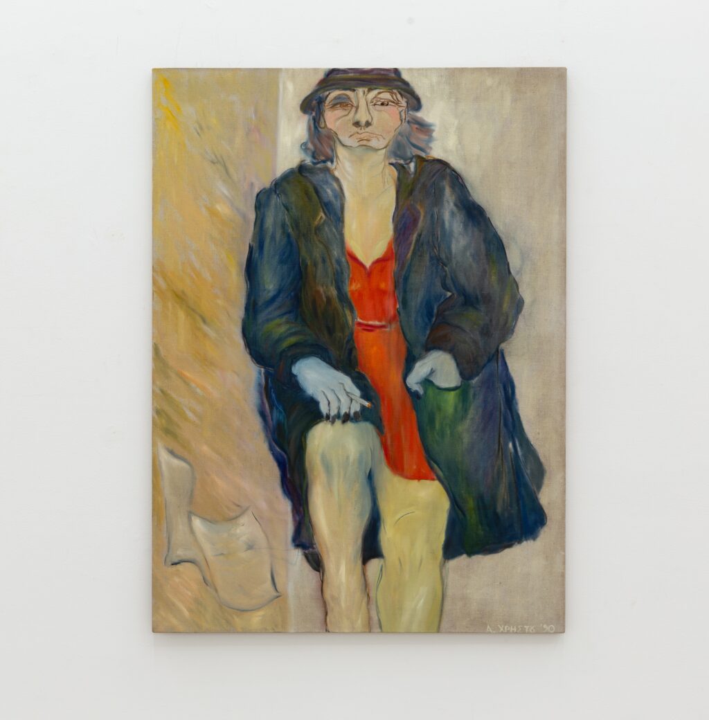 The exhibition unfolds across two interrelated chapters. On one level are Christou’s erotic paintings and drawings of the mid-1990s. On another are portraits of sex workers and women she encountered in her neighbourhood, around the centre of Athens — figures standing outside hotels, sitting beneath exposed lightbulbs, leaning against cars, talking, smoking, waiting.