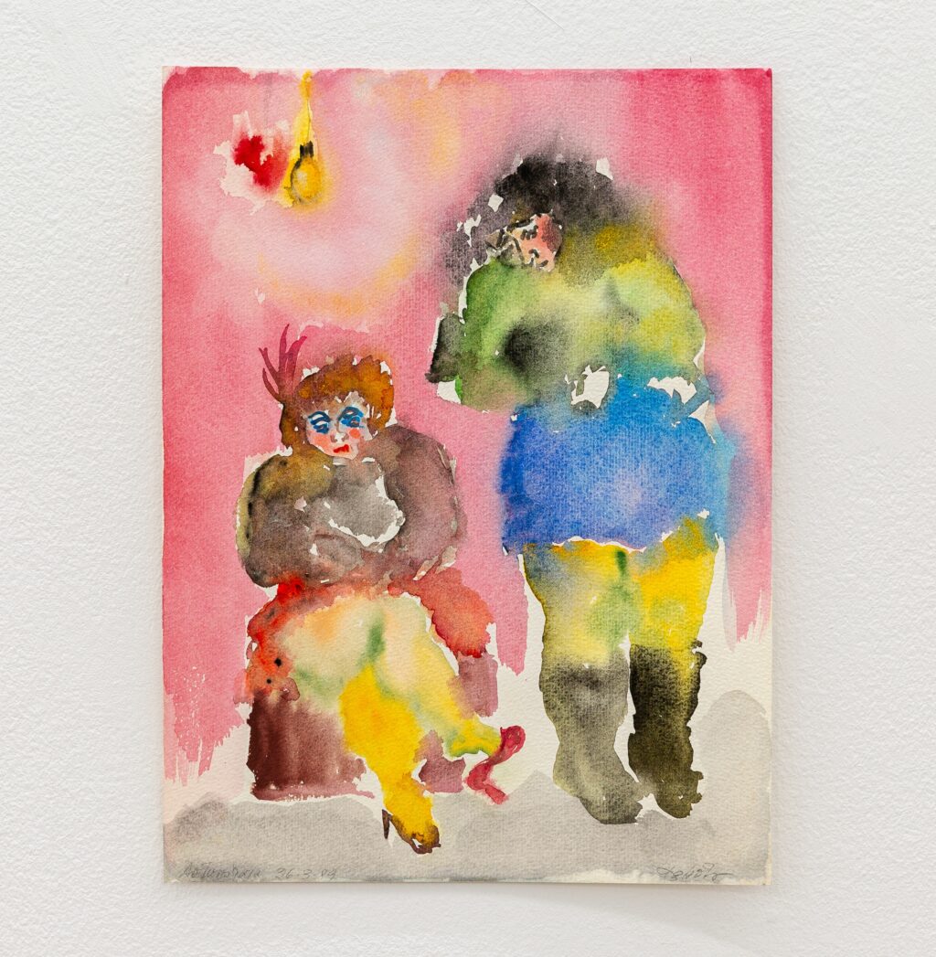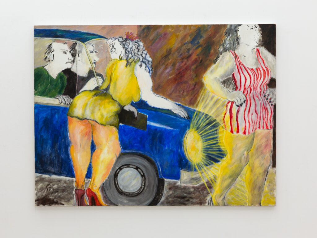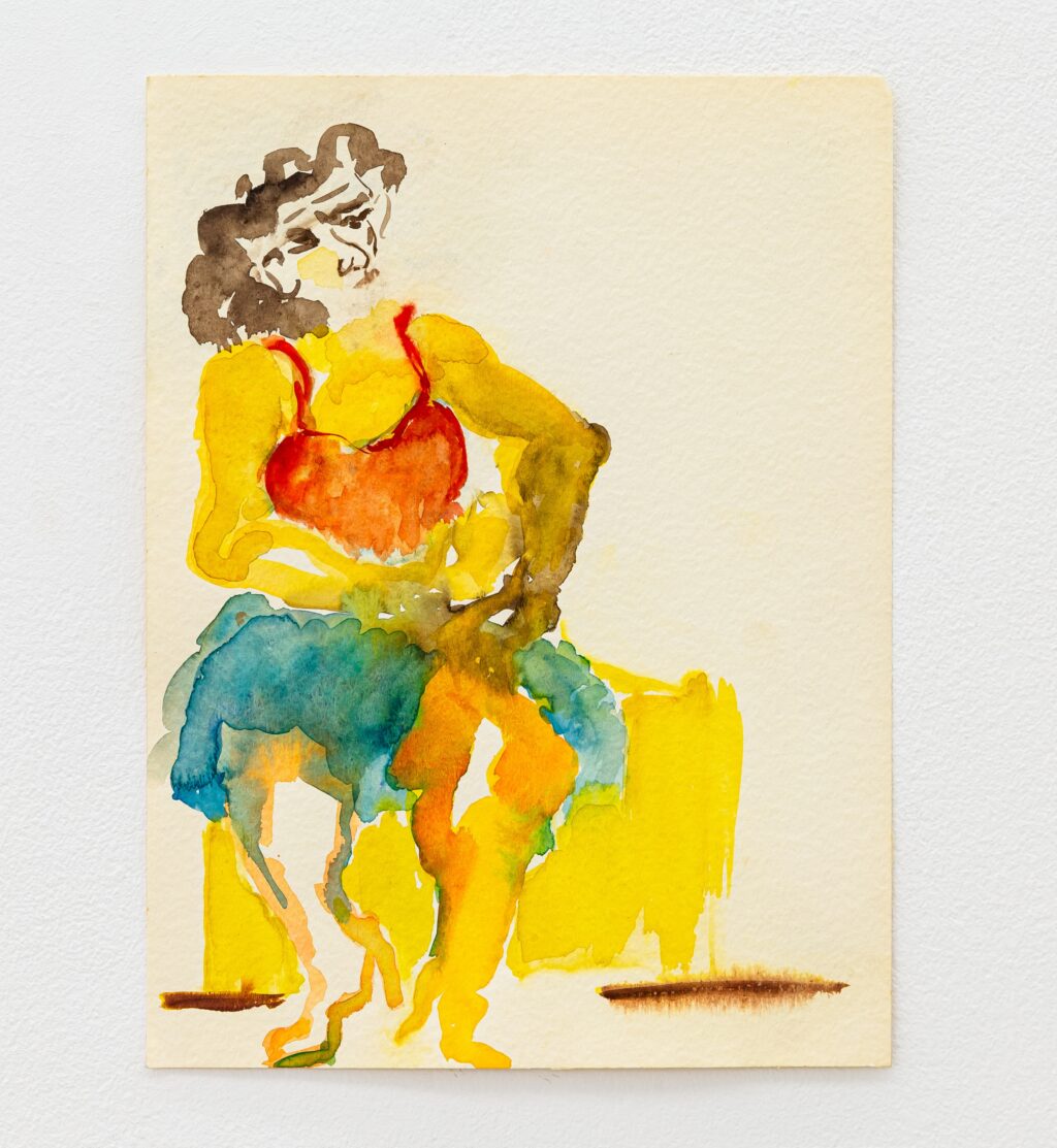 The exhibition unfolds across two interrelated chapters. On one level are Christou’s erotic paintings and drawings of the mid-1990s. On another are portraits of sex workers and women she encountered in her neighbourhood, around the centre of Athens — figures standing outside hotels, sitting beneath exposed lightbulbs, leaning against cars, talking, smoking, waiting.